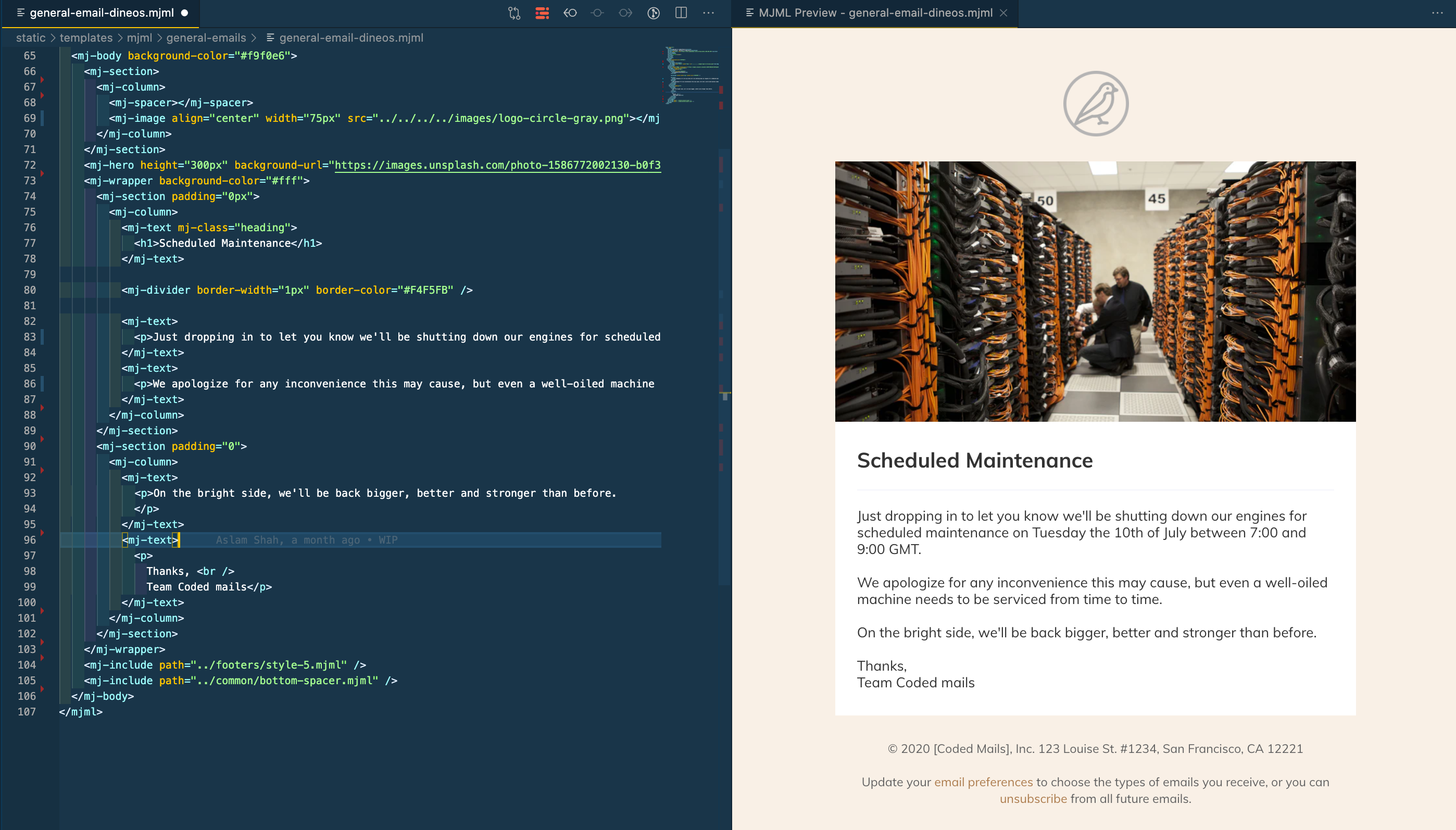 Pro Tip: If you are using VS Code, we highly recommend the MJML Extension to enable a live, split-view preview of your MJML source files.